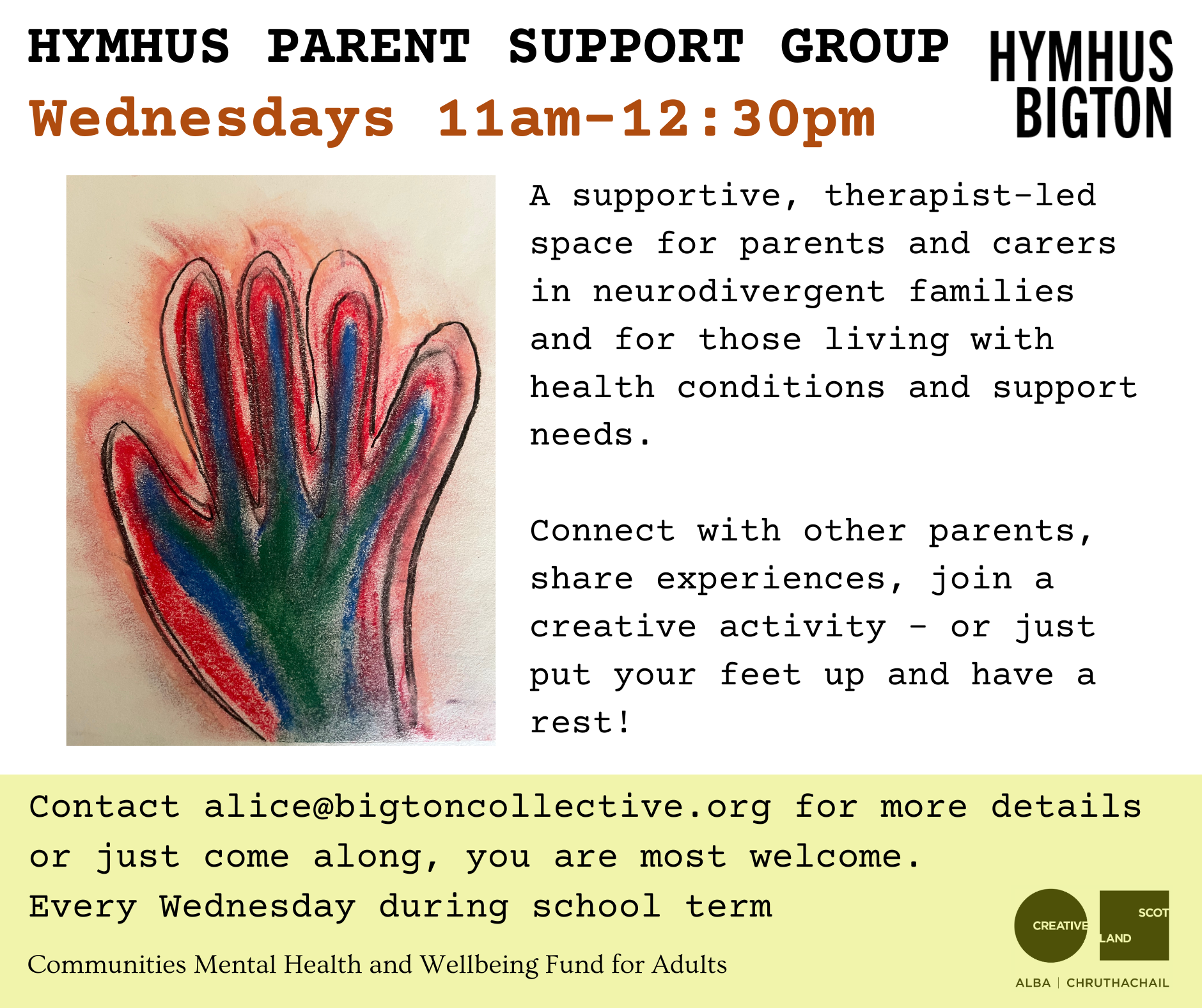 Please get in touch if child-care is a barrier and we can try and help figure something out where possible. We also offer a Musical Playtime group at Hymhus on Monday mornings at 9:30am for parents, carers and babies / pre-school children -